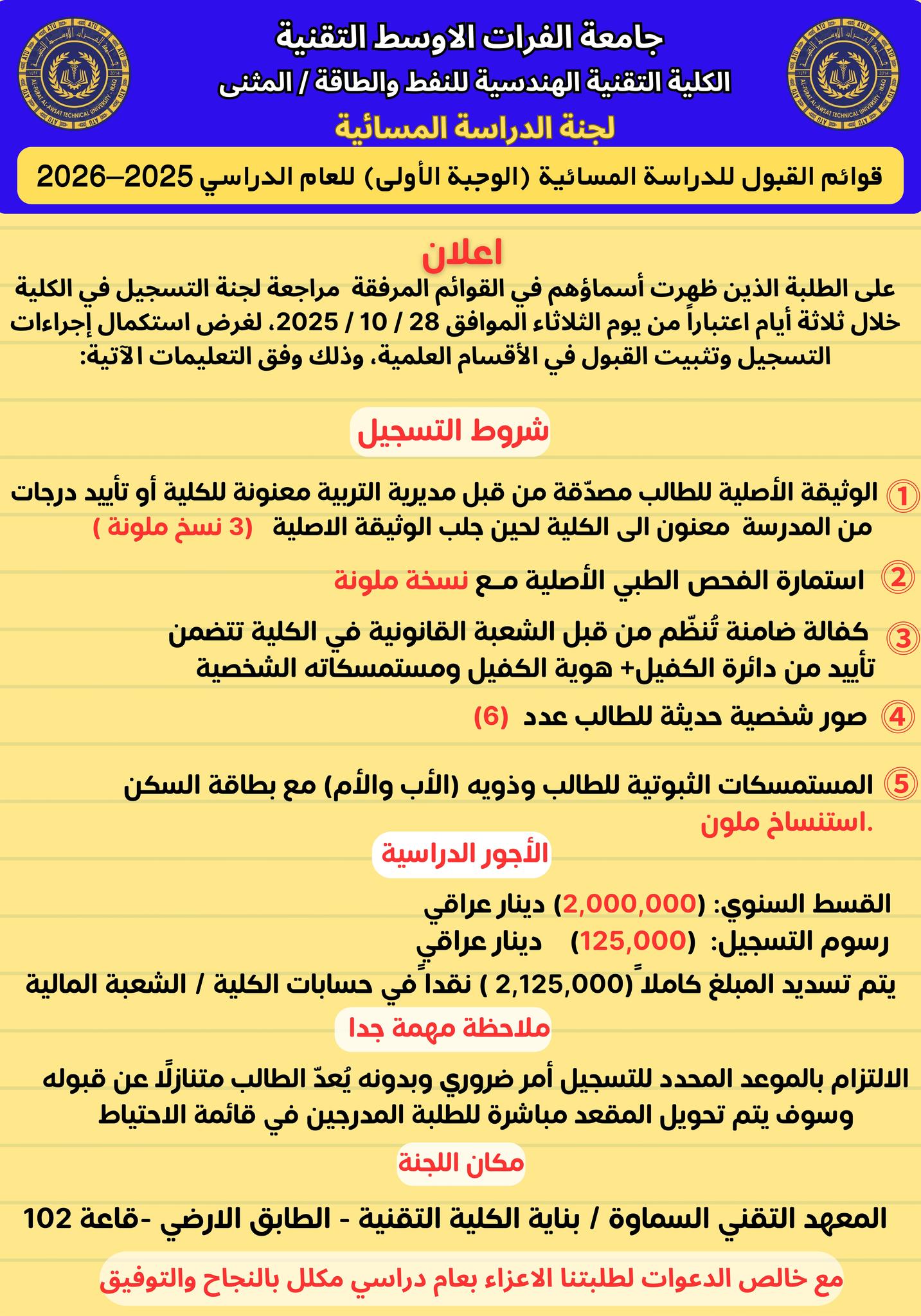 تعلن الكلية التقنية الهندسية للنفط والطاقة إحدى تشكيلات جامعة الفرات الأوسط التقنية عن الوجبة الأولى من خريجي طلبة الدراسة الإعدادية ( علمي -احيائي -تطبيقي )المقبولين للدراسة المسائية في أقسامها المختلفة