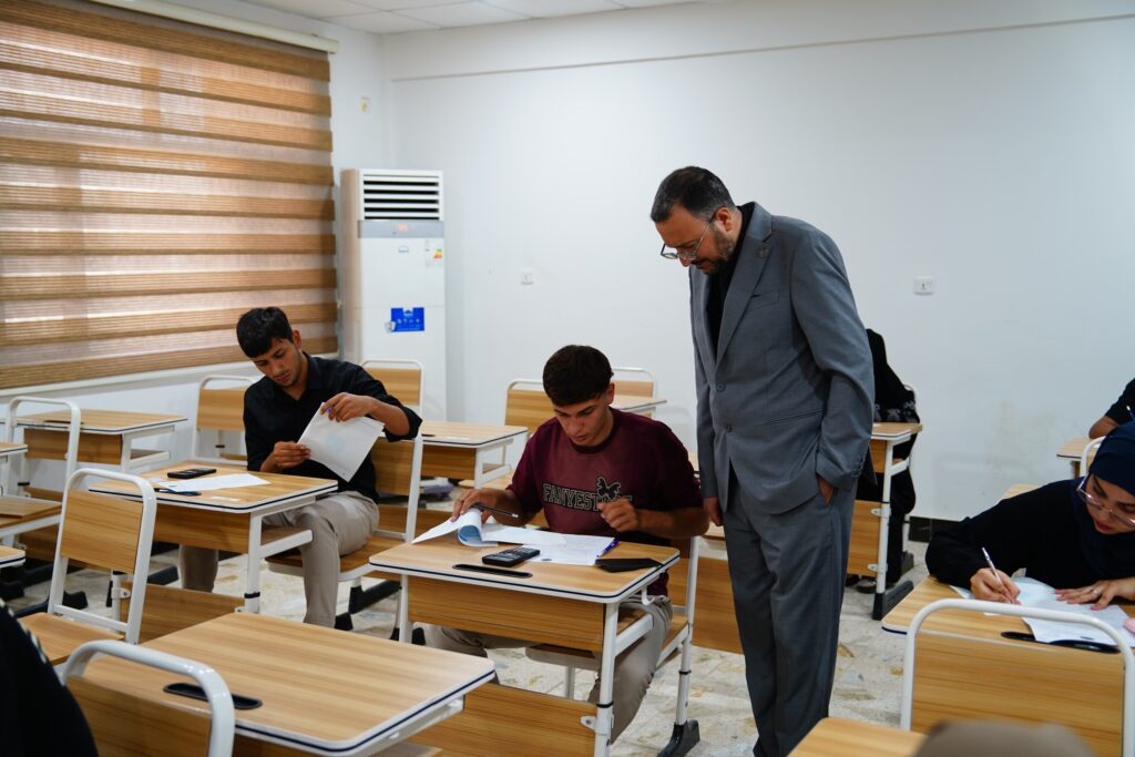 وتفقد السيد عميد الكلية الأستاذ المساعد الدكتور صادق حسن اللوزي القاعات الامتحانية واطلع على سير الامتحانات والإجراءات المتبعة لتوفير الأجواء الملائمة للطلبة، مؤكدا ًحرص الكلية على تهيئة جميع المستلزمات اللازمة لإنجاح العملية الامتحانية.