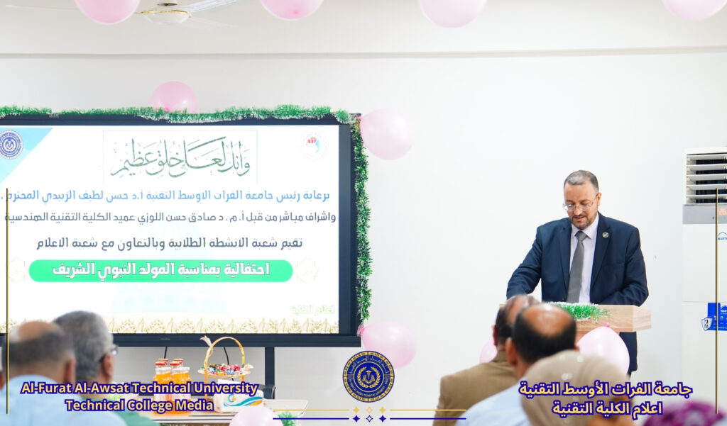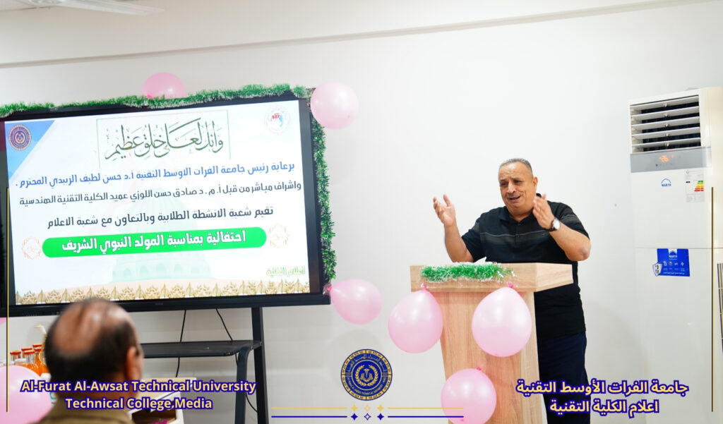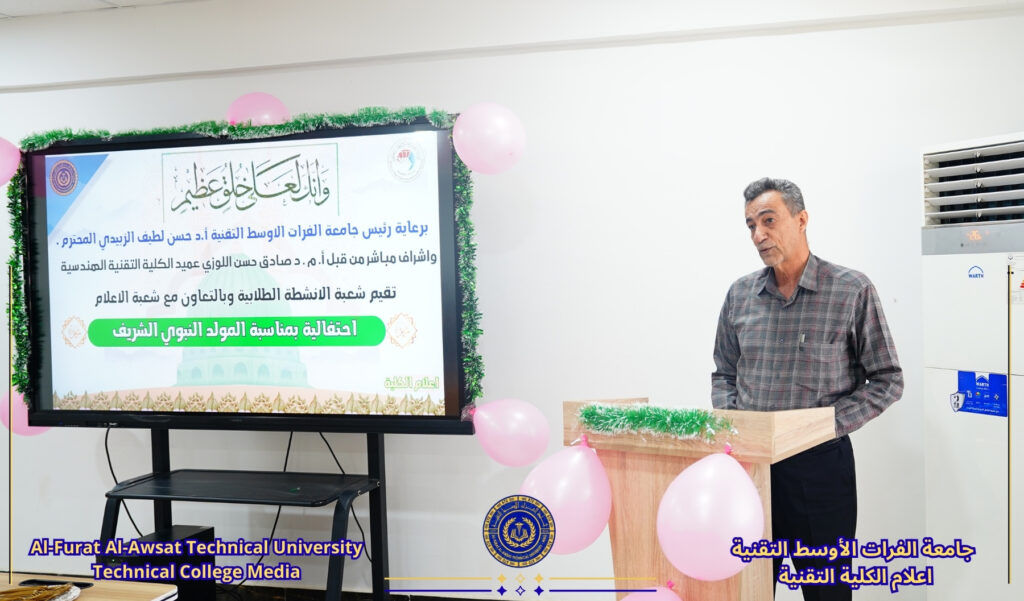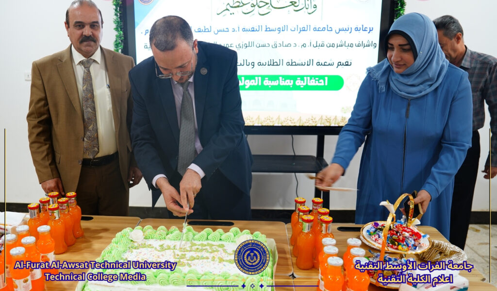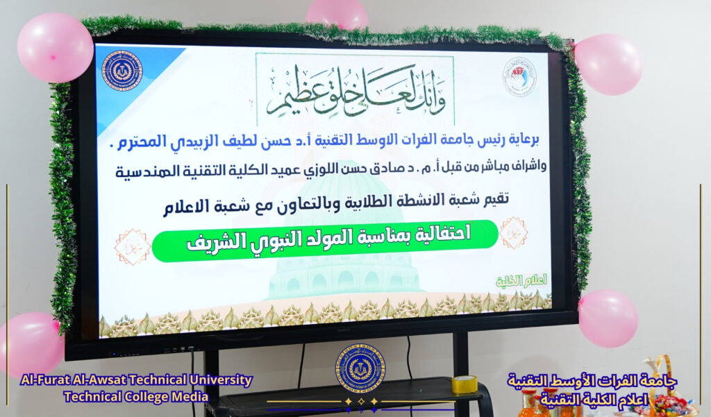 برعاية السيد رئيس جامعة الفرات الأوسط التقنية الأستاذ الدكتور حسن لطيف الزبيدي المحترم وبإشراف مباشر من عميد الكلية الأستاذ المساعد الدكتور صادق حسن اللوزي، نظمت شعبة الأنشطة الطلابية وبالتعاون مع شعبة الإعلام بالكلية احتفالية بمناسبة ذكرى مولد سيد الكائنات وخاتم الأنبياء الرسول الأكرم محمد (ص) وحفيده الإمام جعفر الصادق (ع).