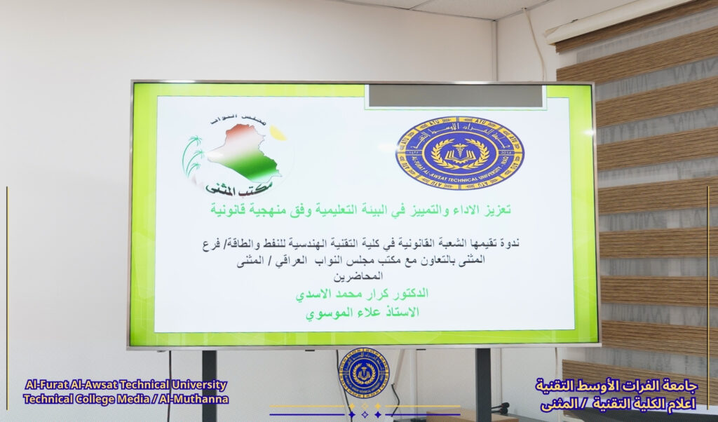 نظمت الشعبة القانونية في الكلية التقنية الهندسية للنفط والطاقة، بالتعاون مع مكتب مجلس النواب العراقي في المثنى، ندوة بعنوان((تعزيز الأداء والتميز في البيئة التعليمية وفق منهجية قانونية))