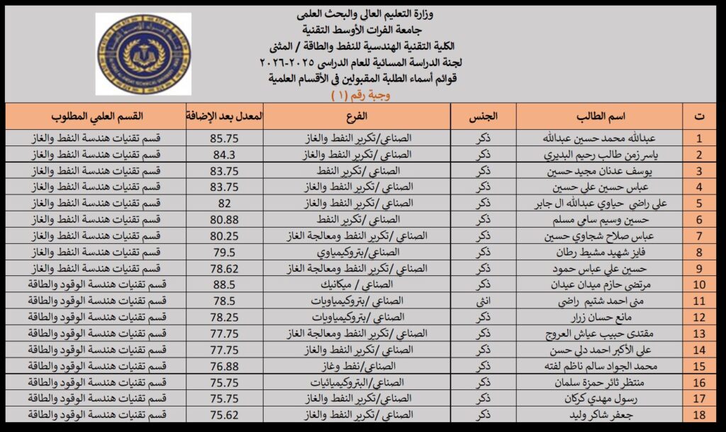 تعلن الكلية التقنية الهندسية للنفط والطاقة إحدى تشكيلات جامعة الفرات الأوسط التقنية عن الوجبة الأولى من خريجي طلبة الدراسة الإعدادية