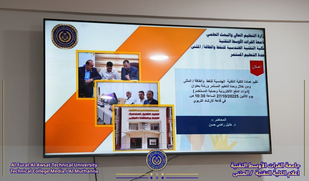 نظمت وحدة التعليم المستمر في الكلية التقنية الهندسية للنفط والطاقة، إحدى تشكيلات جامعة الفرات الأوسط التقنية، ورشة تدريبية بعنوان((أدوات الدفع الإلكتروني وحماية المستخدم))
